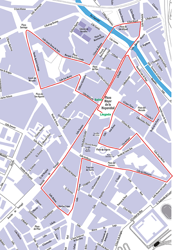 Salida Plaza Mayor, Padilla, Puente de San Miguel, Calle Valladolid, Calle San Miguel, Juan de Álamos, Plaza Marqués de la Ensenada, Santa Teresa de Jesús, izquierda hacia Ronda Apóstol Santiago, San Martín, Plazuela del Teatro, derecha, Alfonso Quintanilla, Almirante, Plaza Mayor, Gamazo, Avda. de Portugal, Calle Malena, Carreras, Artillería, Plaza del Carmen, Villanueva, Ángel Molina, La Antigua, Plaza de Segovia, Bravo, Plaza Mayor derecha por López Flores, Carlos I, Ronda de las Flores, Avda. Lope de Vega hacía Padilla, Meta Plaza Mayor.